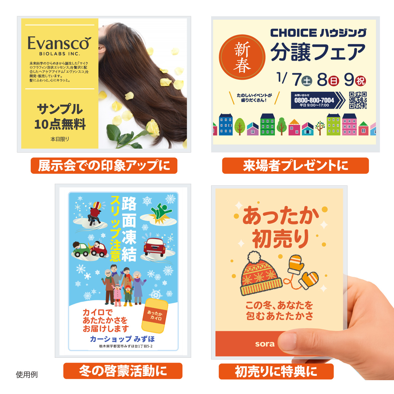 “あたたかさ”をそのまま届ける、冬の人気販促品。 寒い季節の展示会・イベント・街頭配布にぴったり! 受け取った瞬間にうれしい、実用性と気配りを兼ね備えたノベルティです。