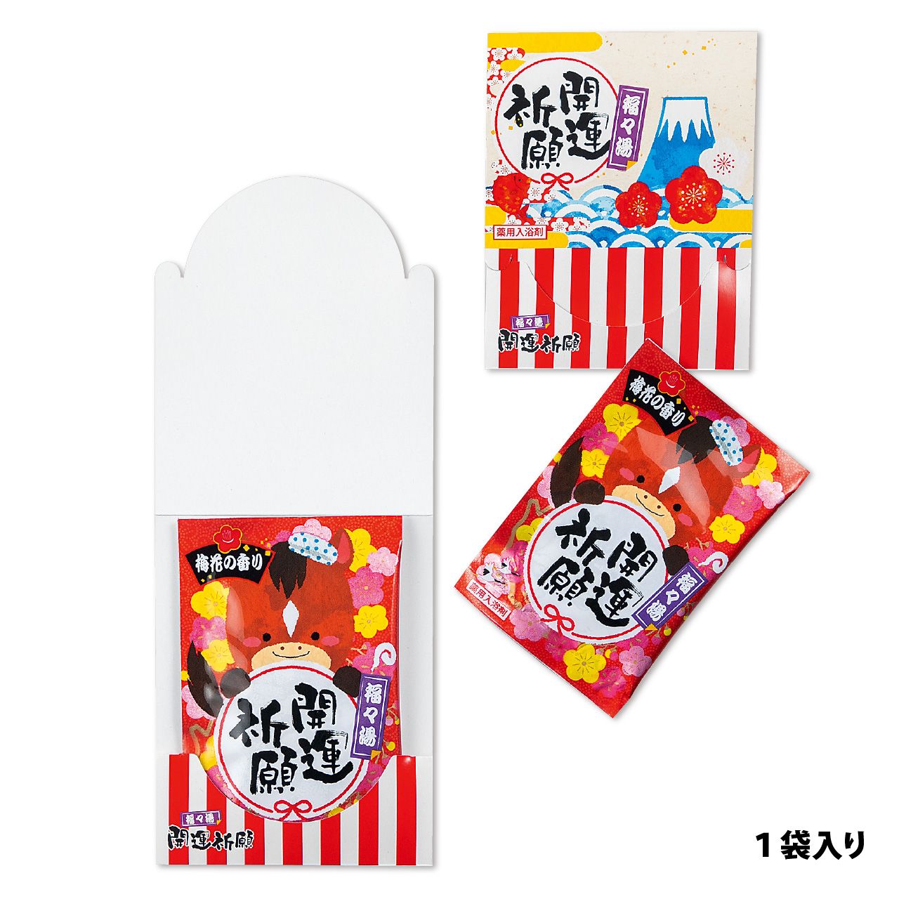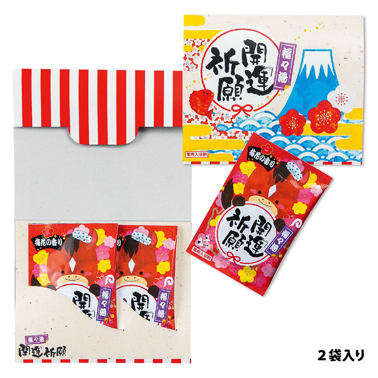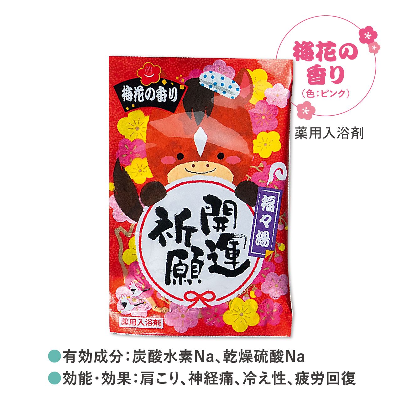 薬用タイプで、肩のこり・神経痛・冷え性・疲労回復に効く入浴剤「福々湯」。 梅花の香りが広がる癒しのひとときを演出します。 かわいらしい午のイラスト入りパッケージは華やかで、年始の販促やご挨拶にぴったり。 毎年早期完売となる人気アイテムです。1袋入り・2袋入りからお選びいただけます。