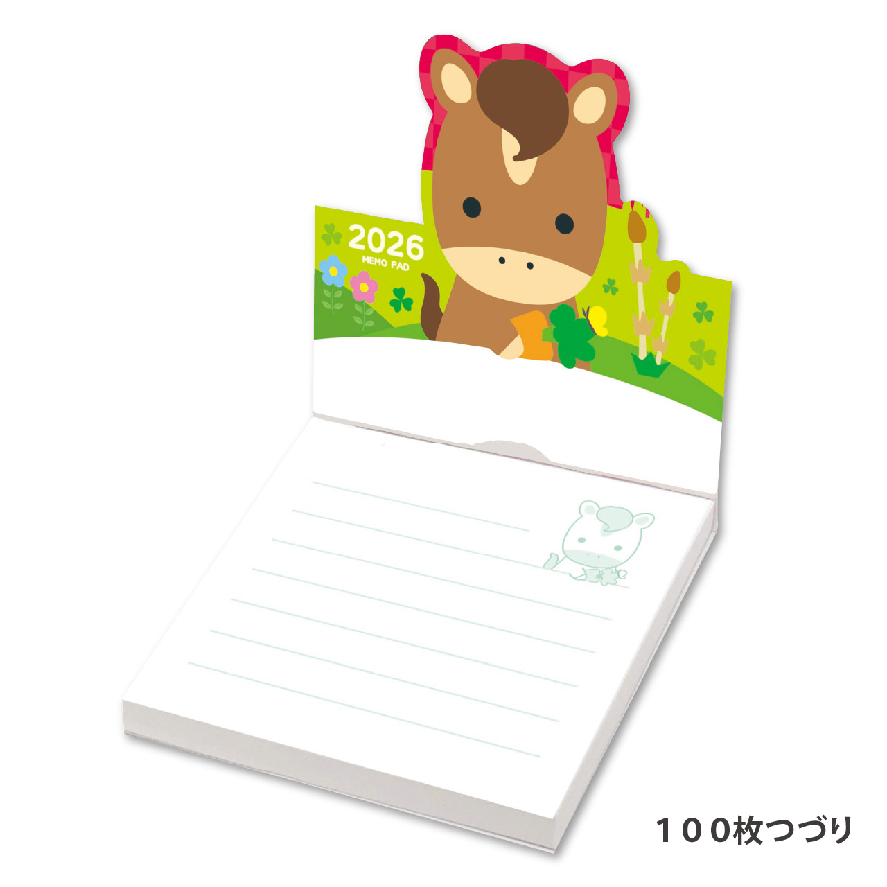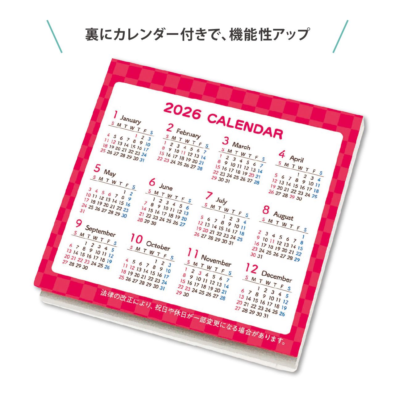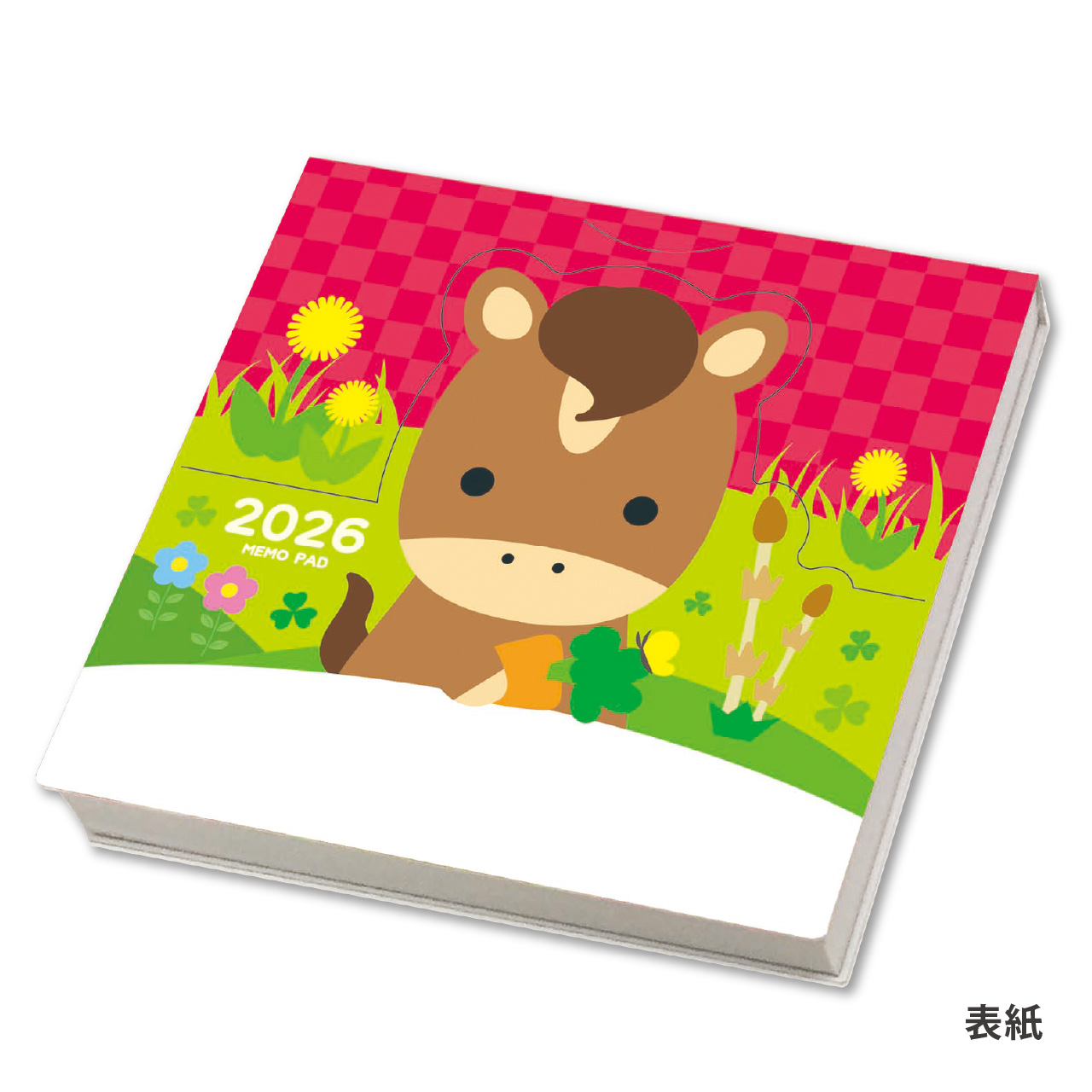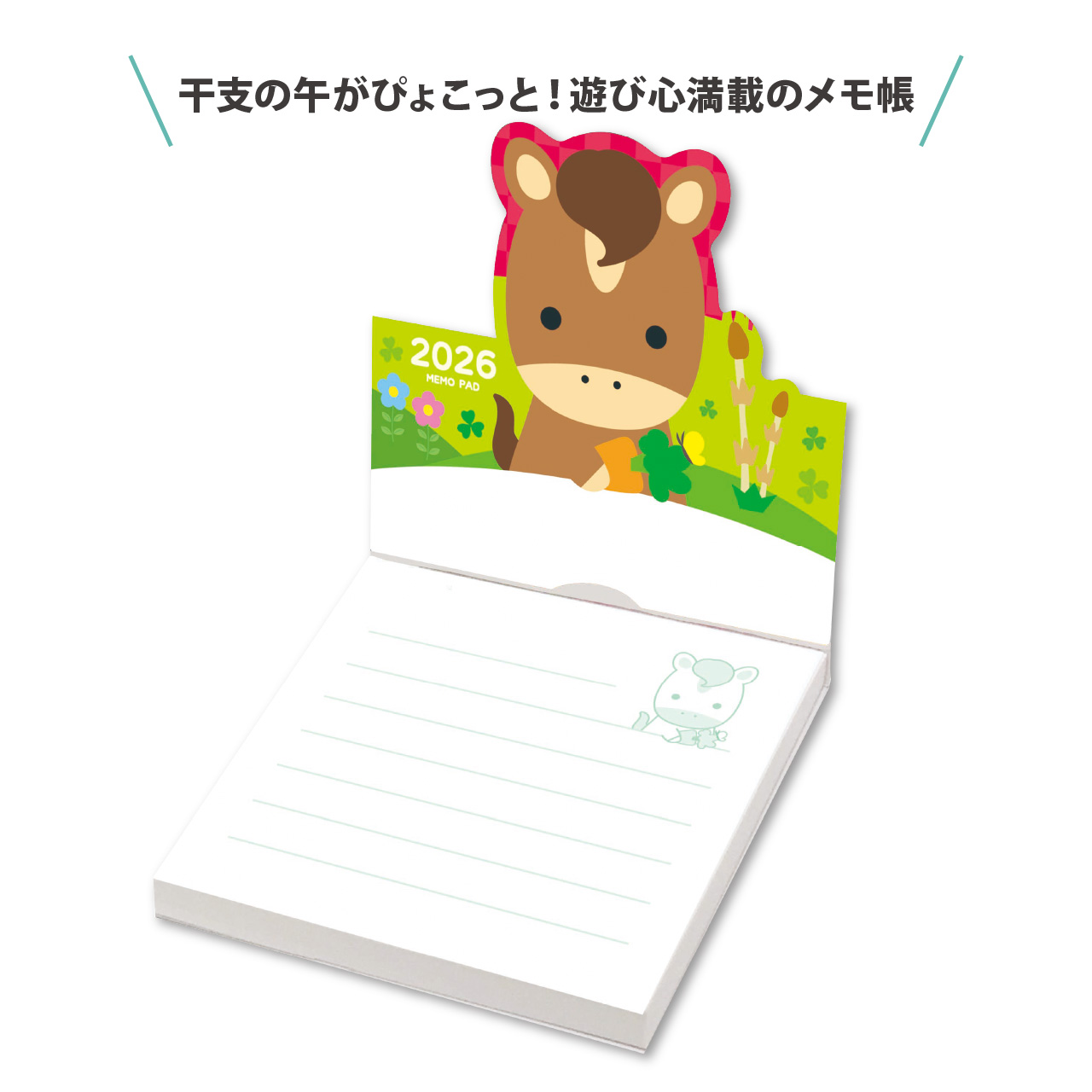 ぴょこんと顔を出す午のイラストがかわいい、干支モチーフのポップアップメモ帳。 裏面には2026年のカレンダー付きで、遊び心と実用性を兼ね備えた迎春アイテムです。 年末年始の販促やイベント配布にぴったり。 企業PRや季節のご挨拶に、印象に残るノベルティとしておすすめです。名入れ対応も可能です。