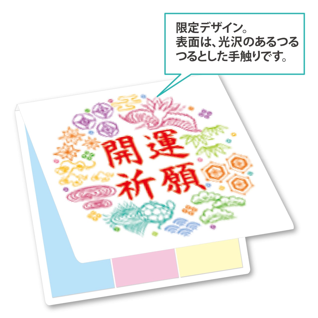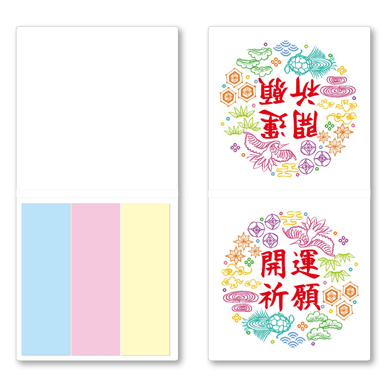 毎年人気の縁起文具「開運祈願ふせん」。新春らしい華やかな表紙カバー付きで、使いやすい3本構成のふせんが計60枚入り。名入れ対応やオリジナルデザインも可能で、新年のご挨拶やイベント販促にぴったりのアイテムです。