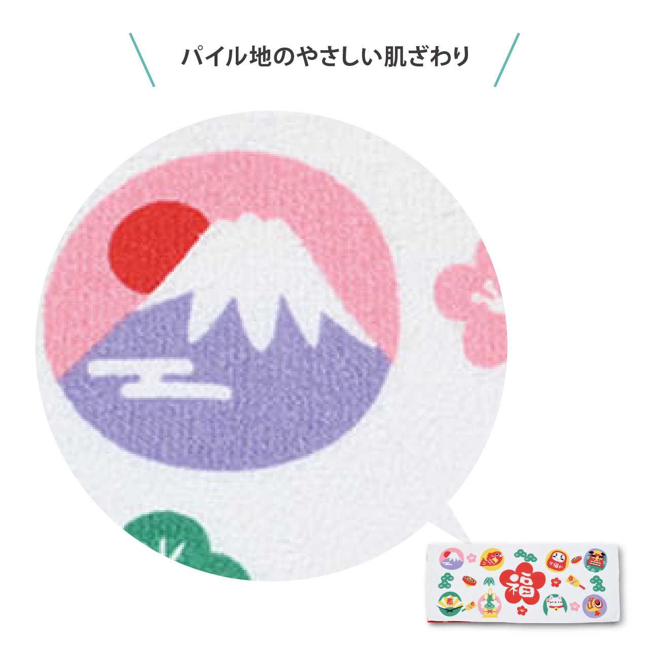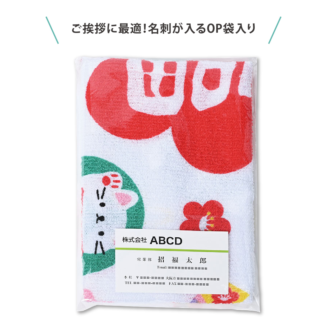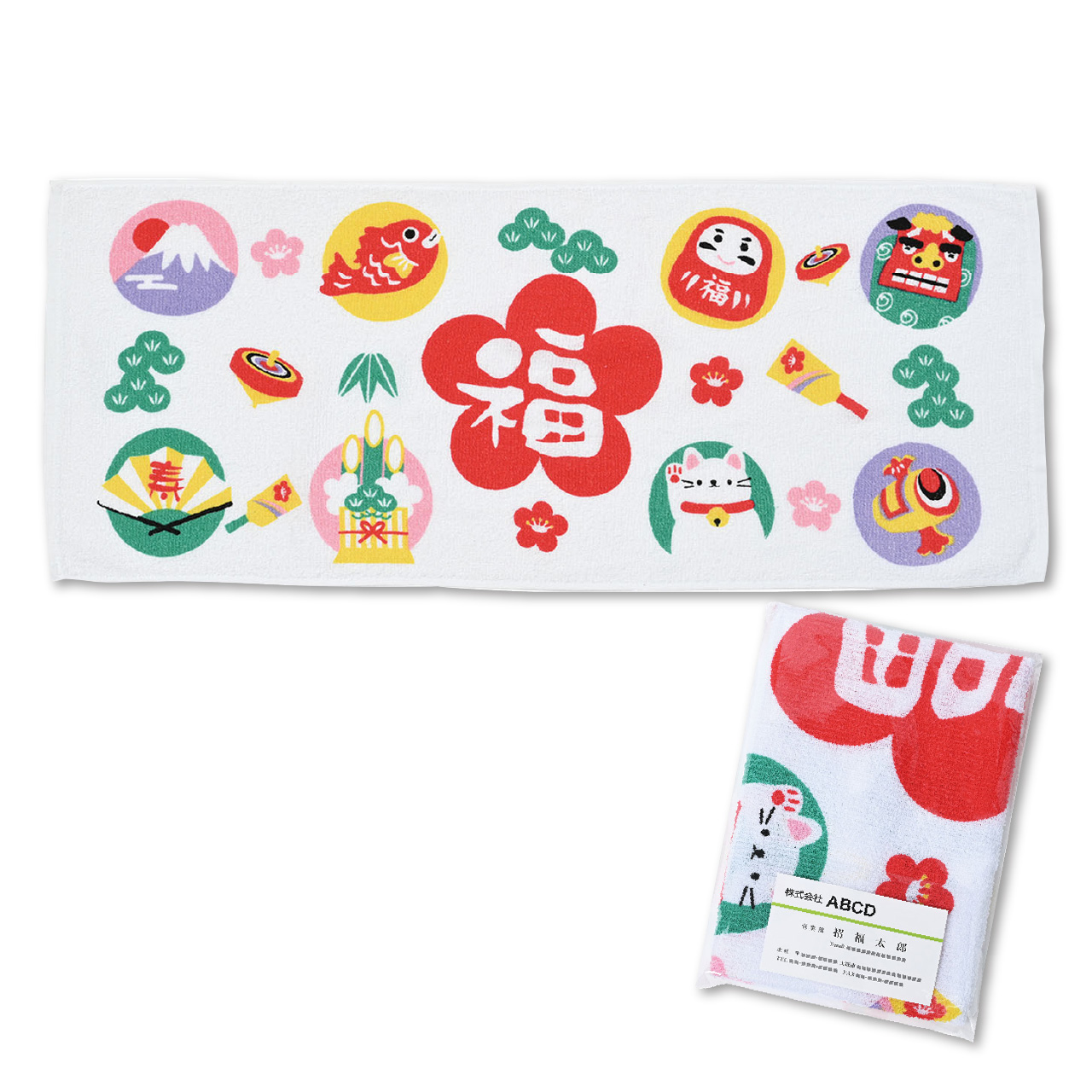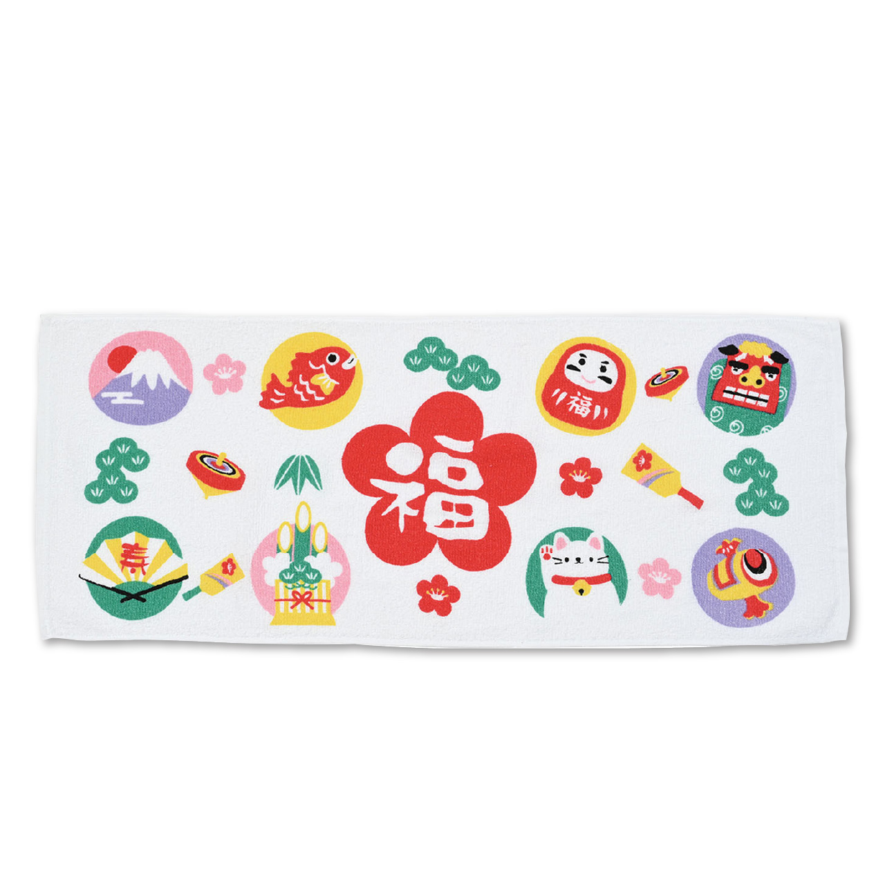 おめでたいモチーフが揃った、迎春にぴったりの福々縁起フェイスタオル。干支や松竹梅など縁起の良い柄が華やかで、年始のご挨拶や新春イベントの配布に最適です。名刺ポケット付きOP袋入りで、そのまま渡せて便利な販促アイテムです。