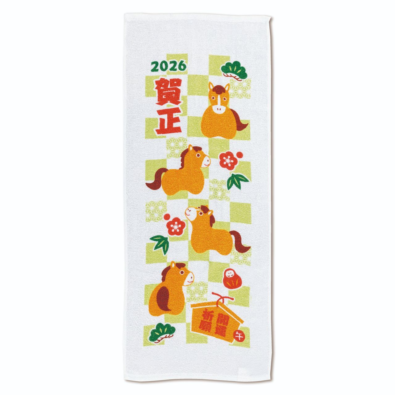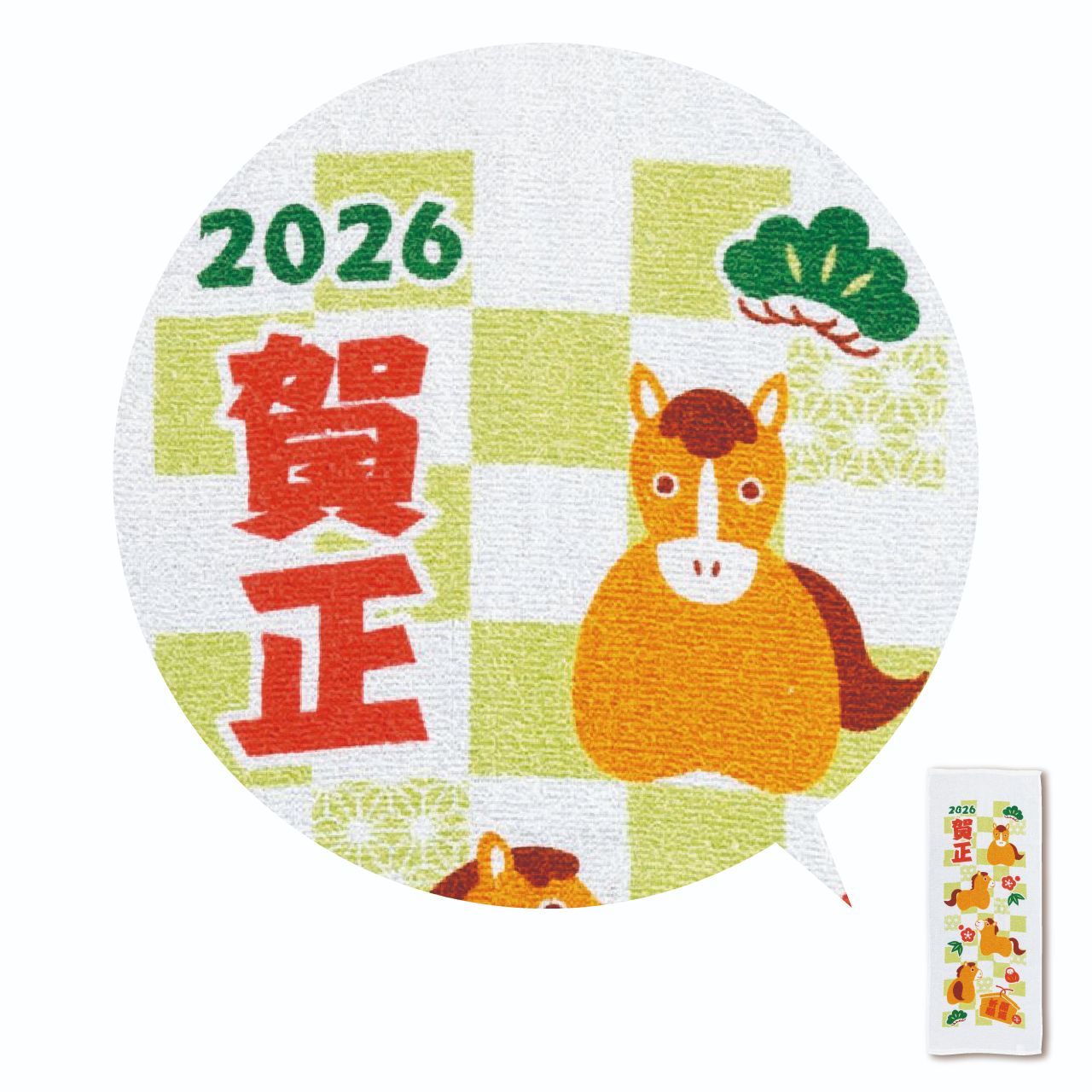毎年人気の干支グッズ「干支タオル」。ポップな午柄が目を引く綿100%のタオルで、年始のご挨拶や新春イベントの配布用にぴったり。そのまま渡せる便利なのし袋入りで、手軽に使える販促アイテムです。