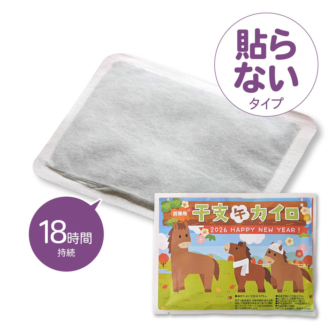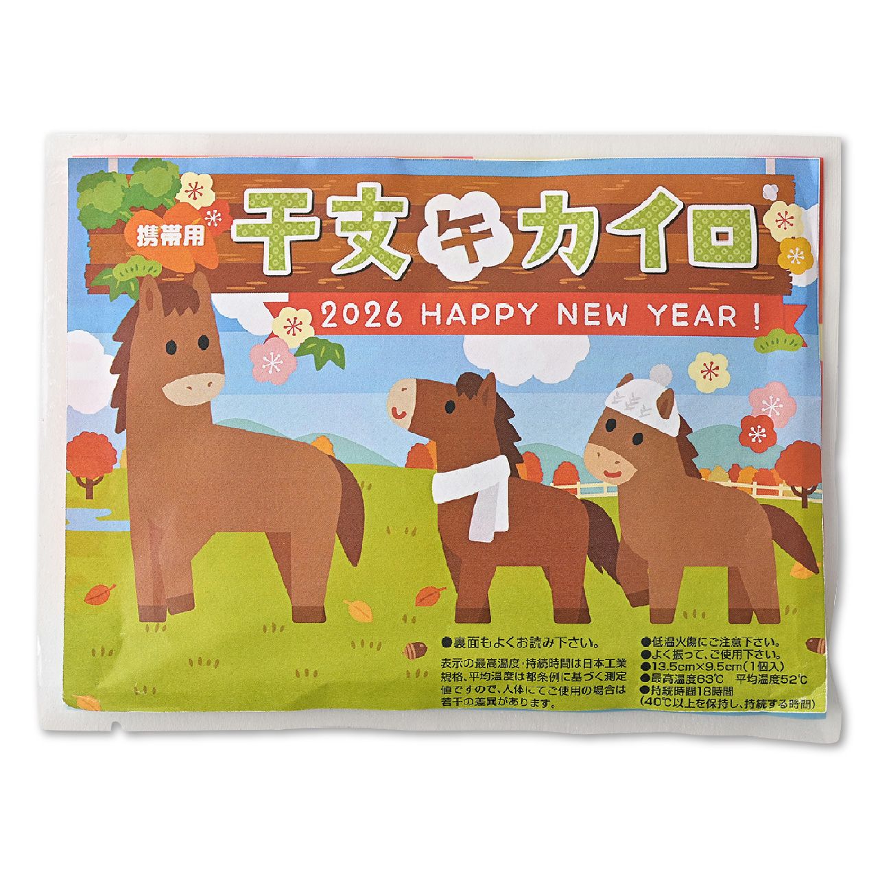 かわいい午のイラストがパッケージに描かれた、迎春の季節感を彩る使い捨てカイロ。寒い冬にうれしい実用アイテムです。 新春キャンペーンやイベント配布、年末年始のご挨拶にもぴったりな販促品です。