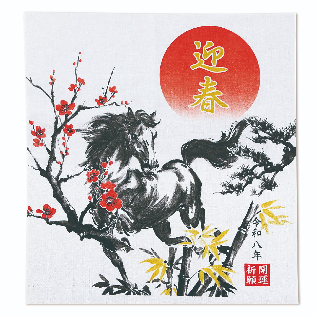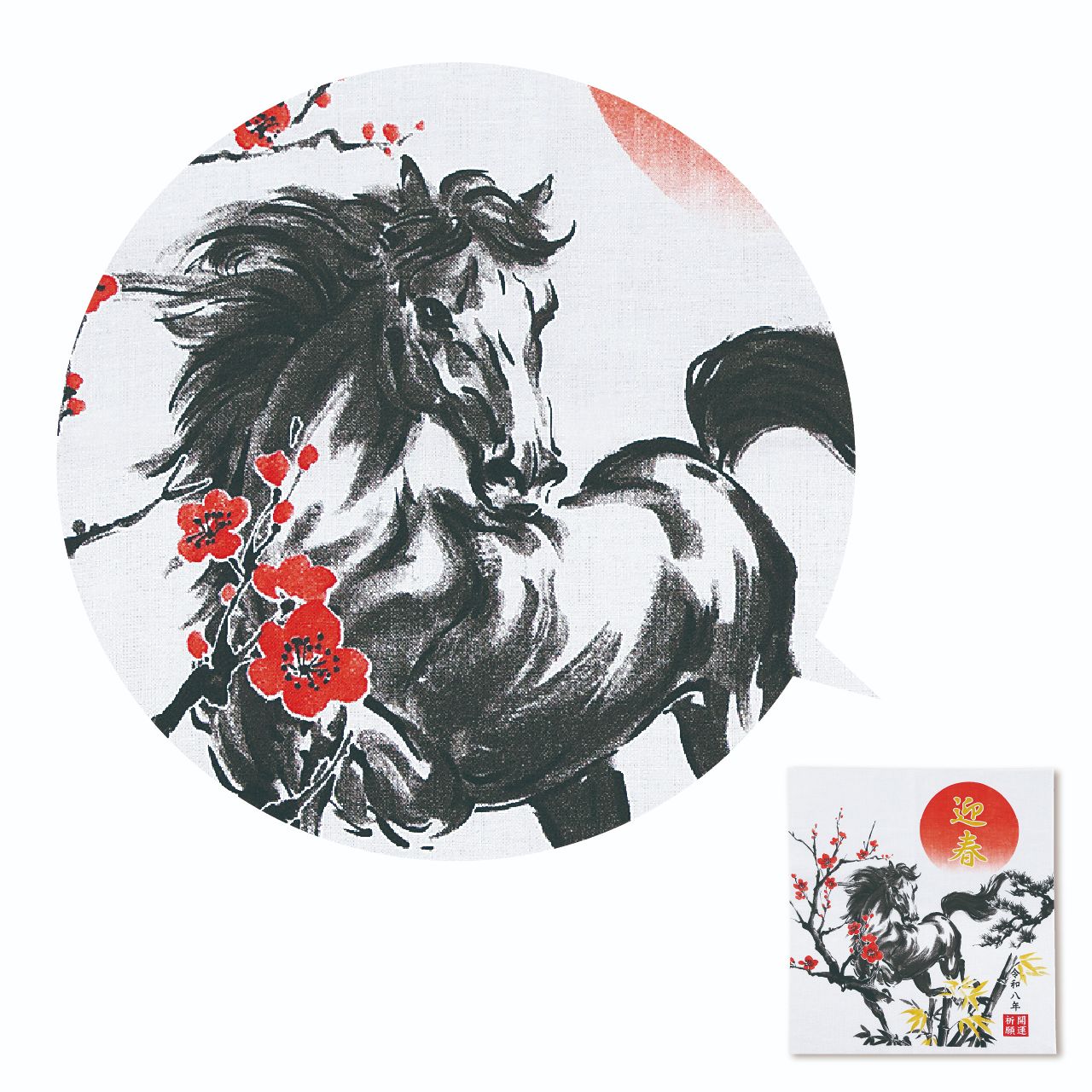 毎年人気の縁起グッズ「開運ふきん」。干支の午、松・竹・梅を水墨画タッチで描いた日本製のふきんです。綿100%のやさしい素材で、実用性と縁起の良さを兼ね備えた一枚。新春らしい贈り物や販促品としておすすめです。