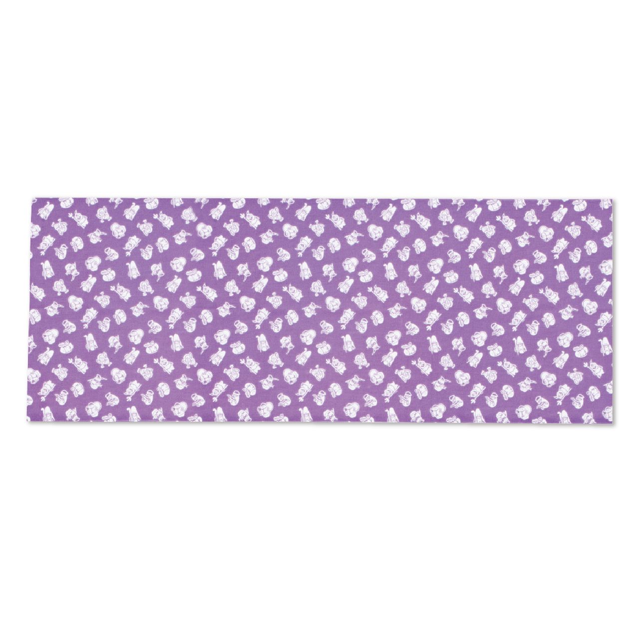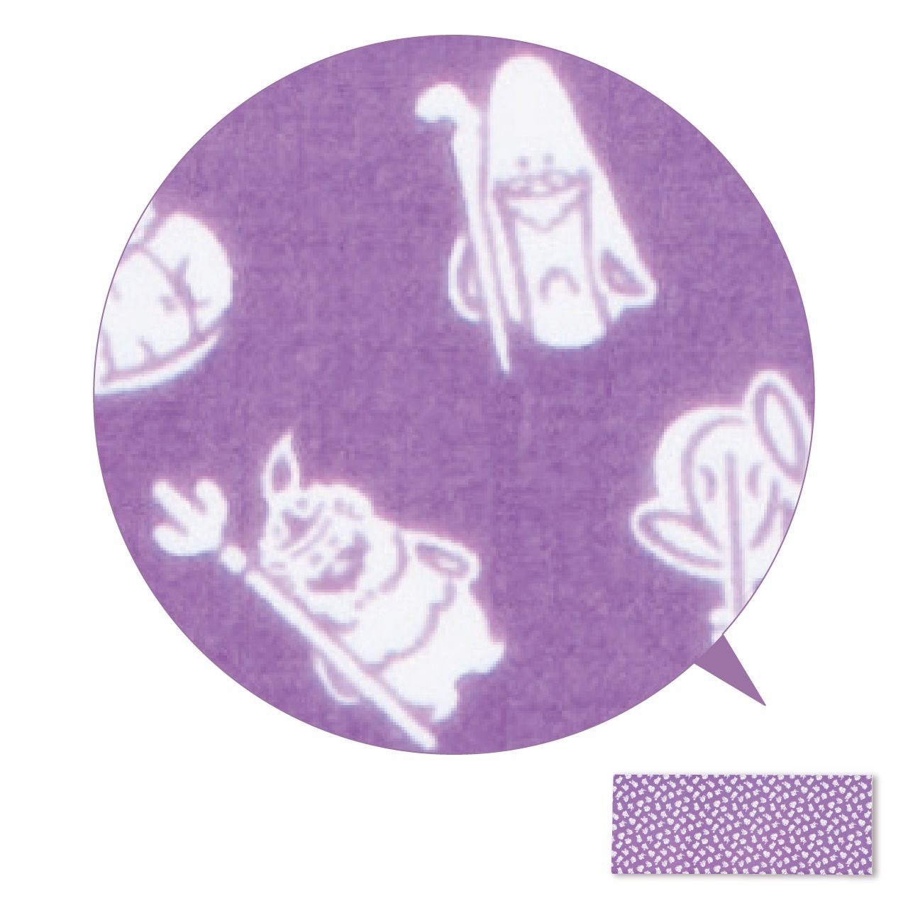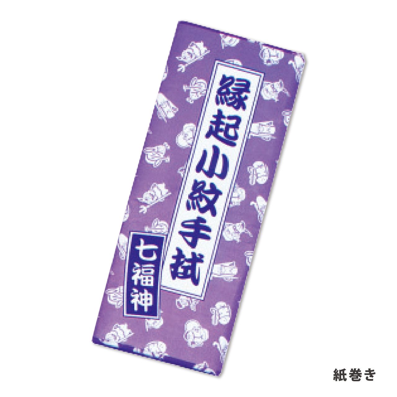 毎年人気の縁起グッズ「縁起小紋手拭(七福神)」。紫色の生地に七福神のイラストが並ぶ、日本製の手ぬぐいです。落ち着いた色合いとかわいい絵柄が魅力で、年始の贈り物や販促品にぴったりの一枚です。